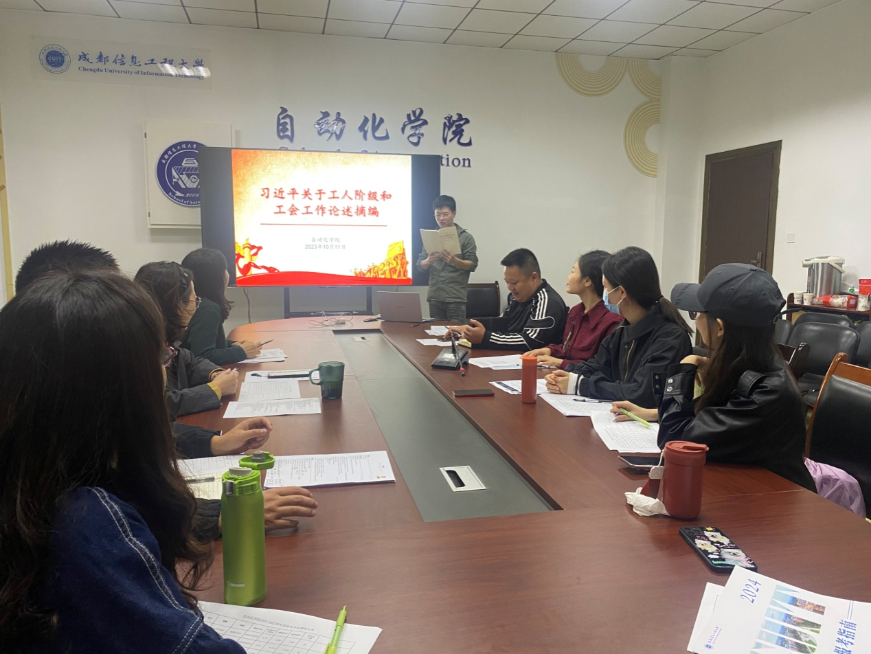 10月11日,自动化学院分工会在信息楼104会议室组织召开《习近平关于工人阶级和工会工作论述摘编》专题学习。学院党委书记胡雪飞,学院党委副书记张勇及学院部分会员出席并参加了学习。专题学习由学院分工会主席沈杭主持。