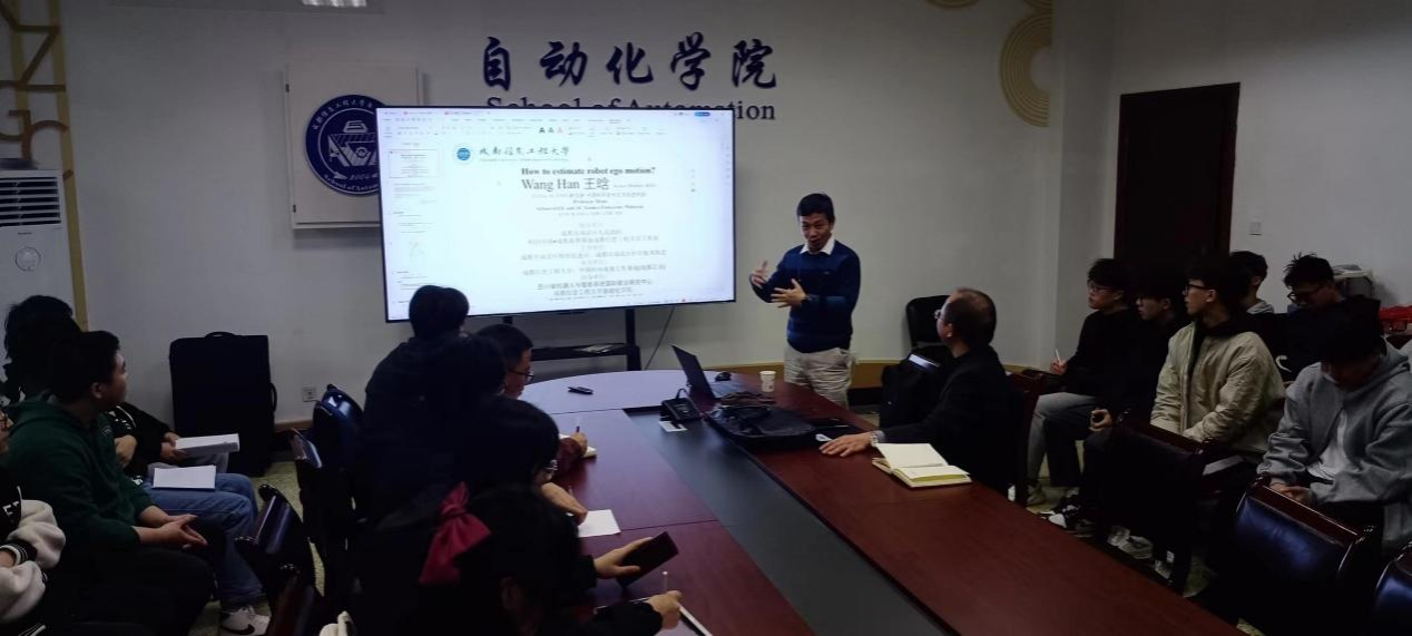 本次讲座围绕" How to estimate robot ego motion?"(如何估计机器人自我运动?)的主题,介绍了利用安装在机器人上的摄像头拍摄的序列图像来解决机器人运动状态的最新解决方案。王晗教授首先向师生讲解了利用点云的SVD解决方案的数学原理。基于此原理,他提出了从像点旋转的四元数解。最后,他用多个视频向观众展示了该技术的多个成功应用案例。讲座现场互动气氛轻松而热烈。