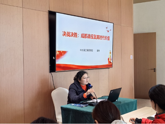 结对共建主题党日活动邀请蒲江县委党校副校长凌玲以《决战决胜:成都战役及其时代价值》为题讲授专题党课。她从历史背景、战役进程、精神传承三个维度展开论述。凌玲强调:"成都战役作为解放战争最后一次大规模作战,其蕴含的斗争精神、人民至上理念和实事求是作风,对新时代高校党建具有重要启示意义。"